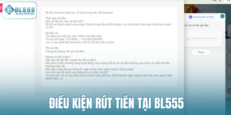 - Nhà cái quy định rõ giới hạn số tiền cho mỗi lần rút tối thiểu 200.000 đồng và tối đa 100 triệu đồng cho một giao dịch. Quy định này sẽ giúp hệ thống xử lý giao dịch rút tiền BL555 an toàn và hạn chế các rủi ro gian lận.